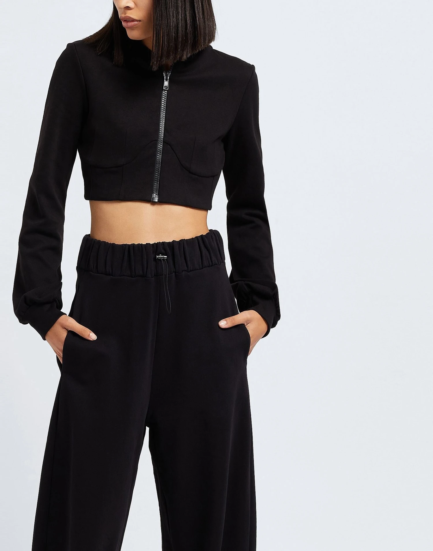 This hooded sweatshirt with long sleeves and a zipper closure is made from pure-cotton jersey in a solid color. Its cropped cut and visible stitching at the body’s hem ensure standout style. Model is 5’9″/175 cm tall and wears an Italian size S/40.