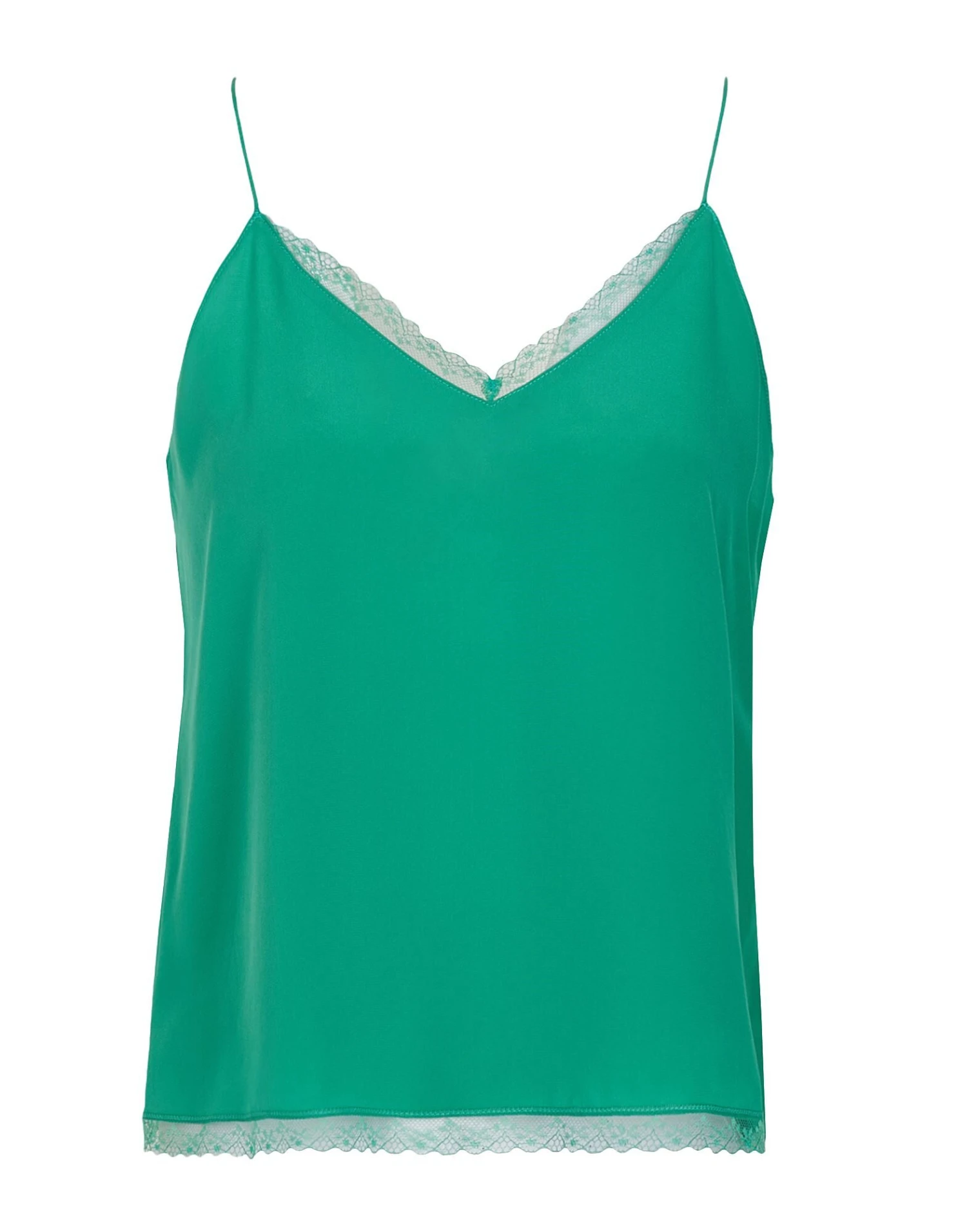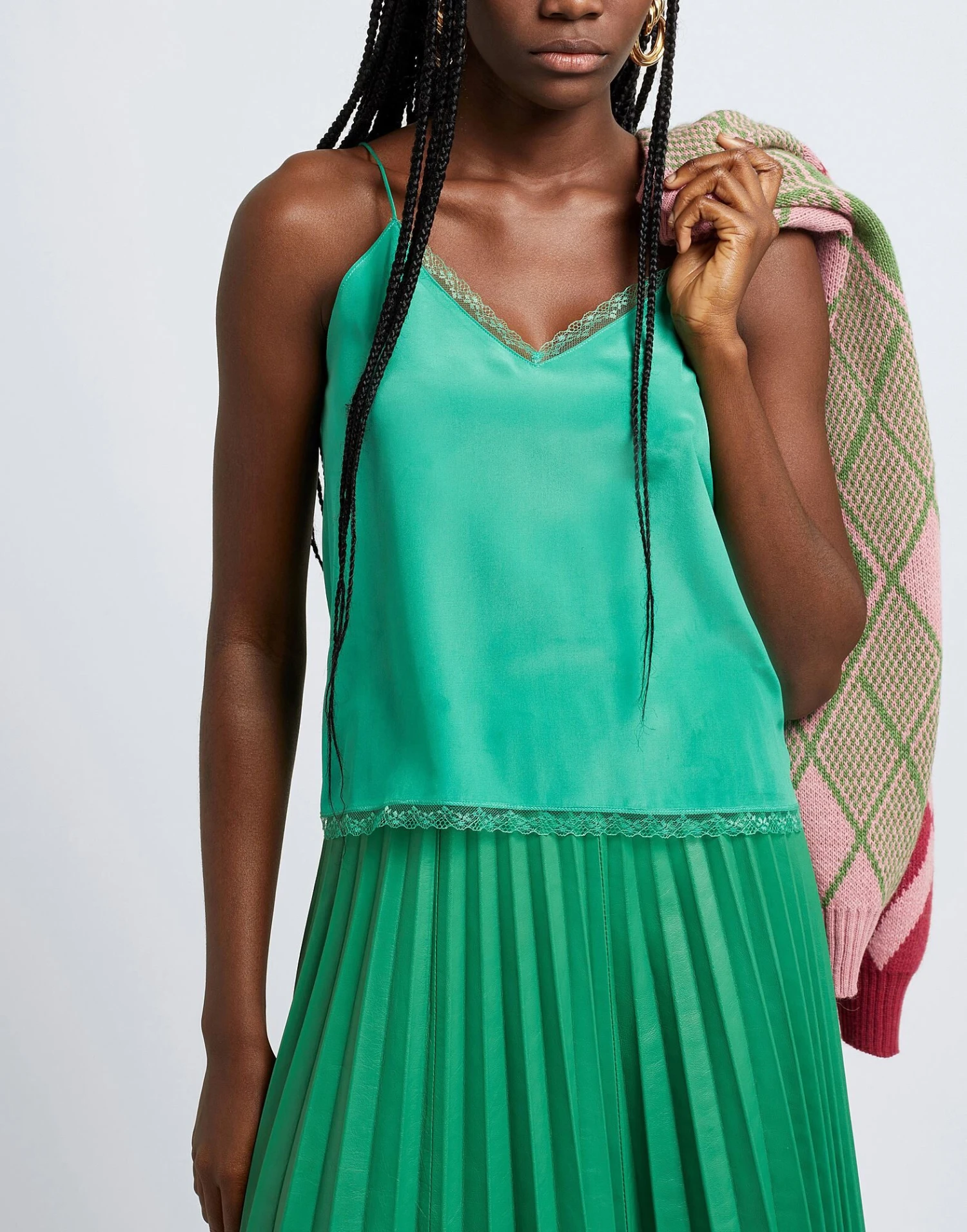 Made from solid-color silk crepe, this camisole is designed with a V-neck and thin straps. It stands out thanks to the tone-on-tone lace details that embellish the neckline and hem.The model is wearing an Italian size S/40. This garment contains a Digital ID, meaning you can discover a world of exclusive content about your piece; scan the QR code on the item’s care label.