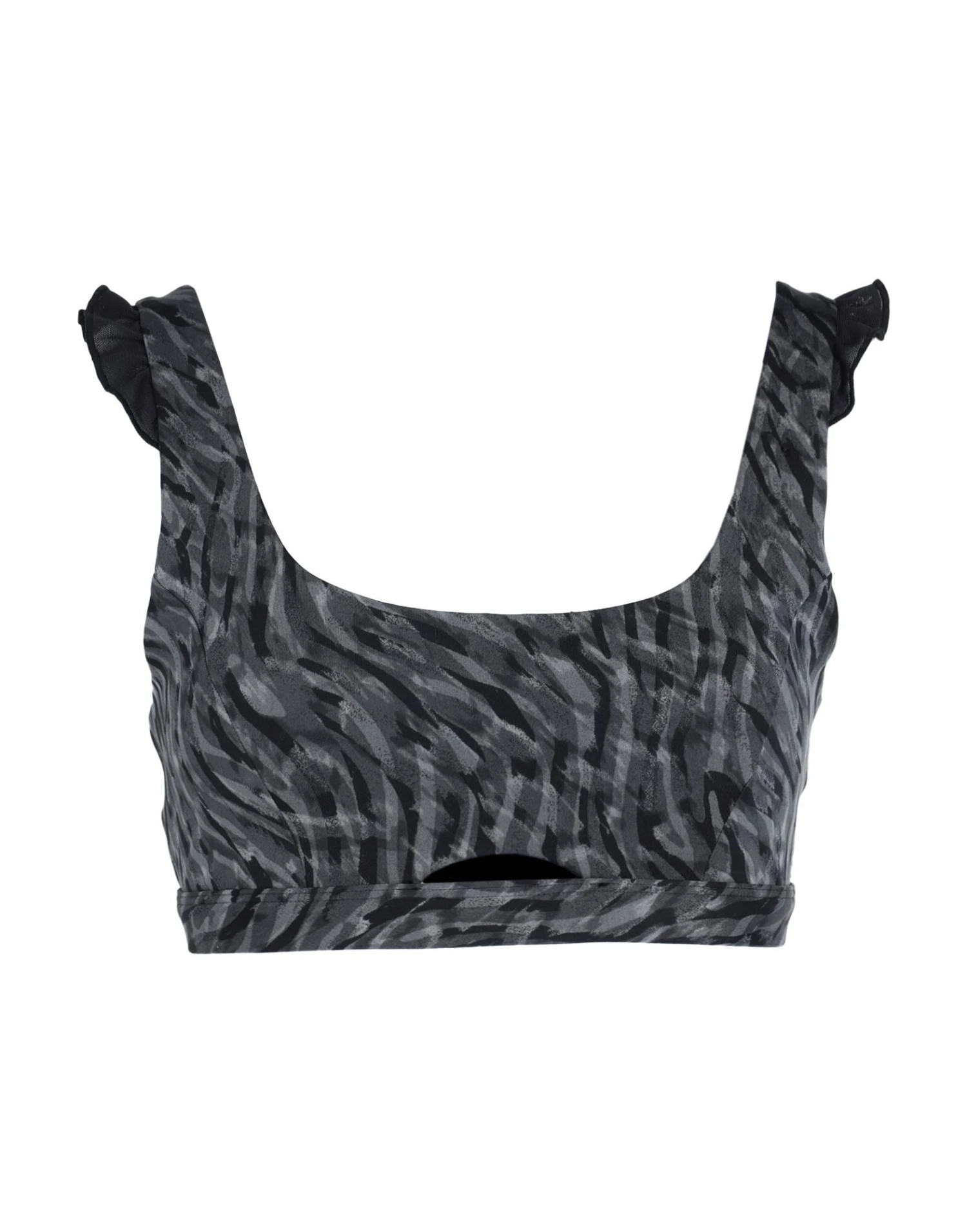 synthetic jersey, ruffles, brand logo, multicolor pattern, deep neckline, sleeveless, removable padded lining, lifestyle, small sized