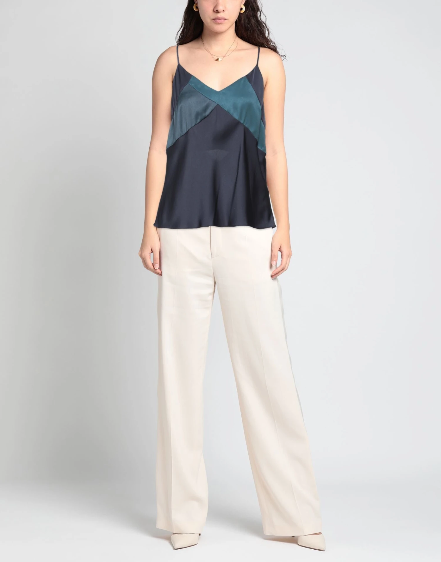 satin, no appliqués, multicolor pattern, deep neckline, sleeveless, no pockets, partially lined interior