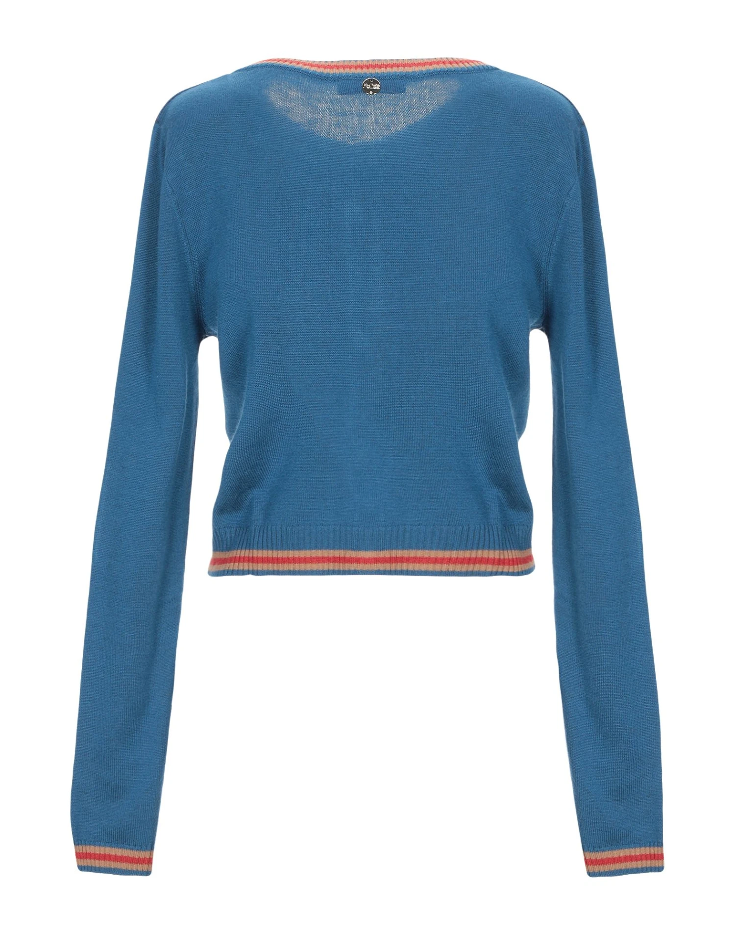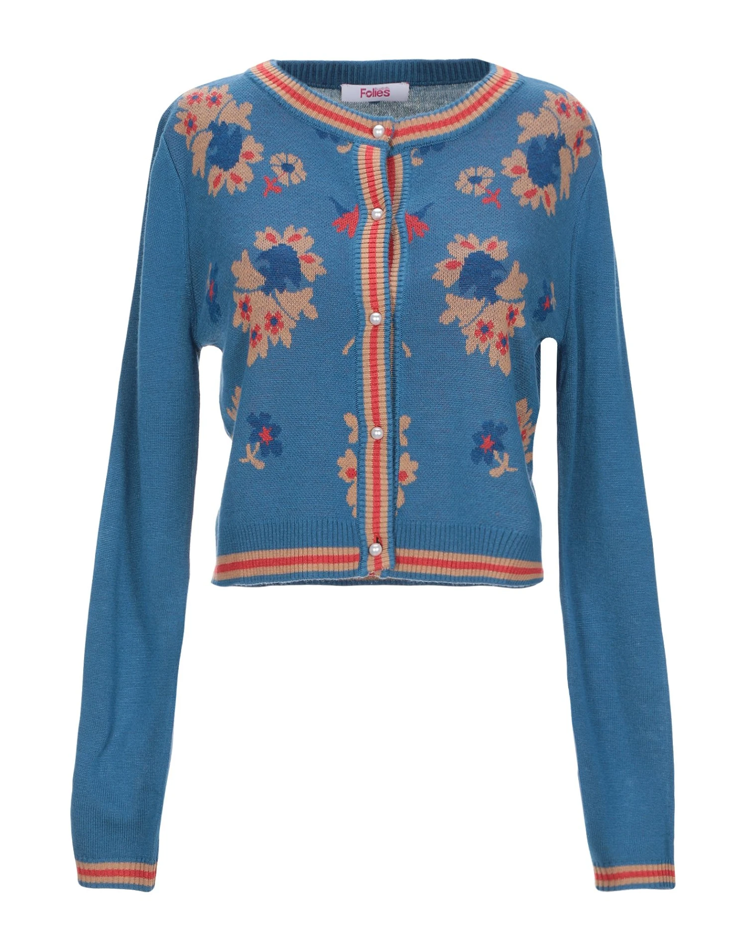 knitted, logo, floral design, round collar, medium-weight sweater, front closure, long sleeves, no pockets