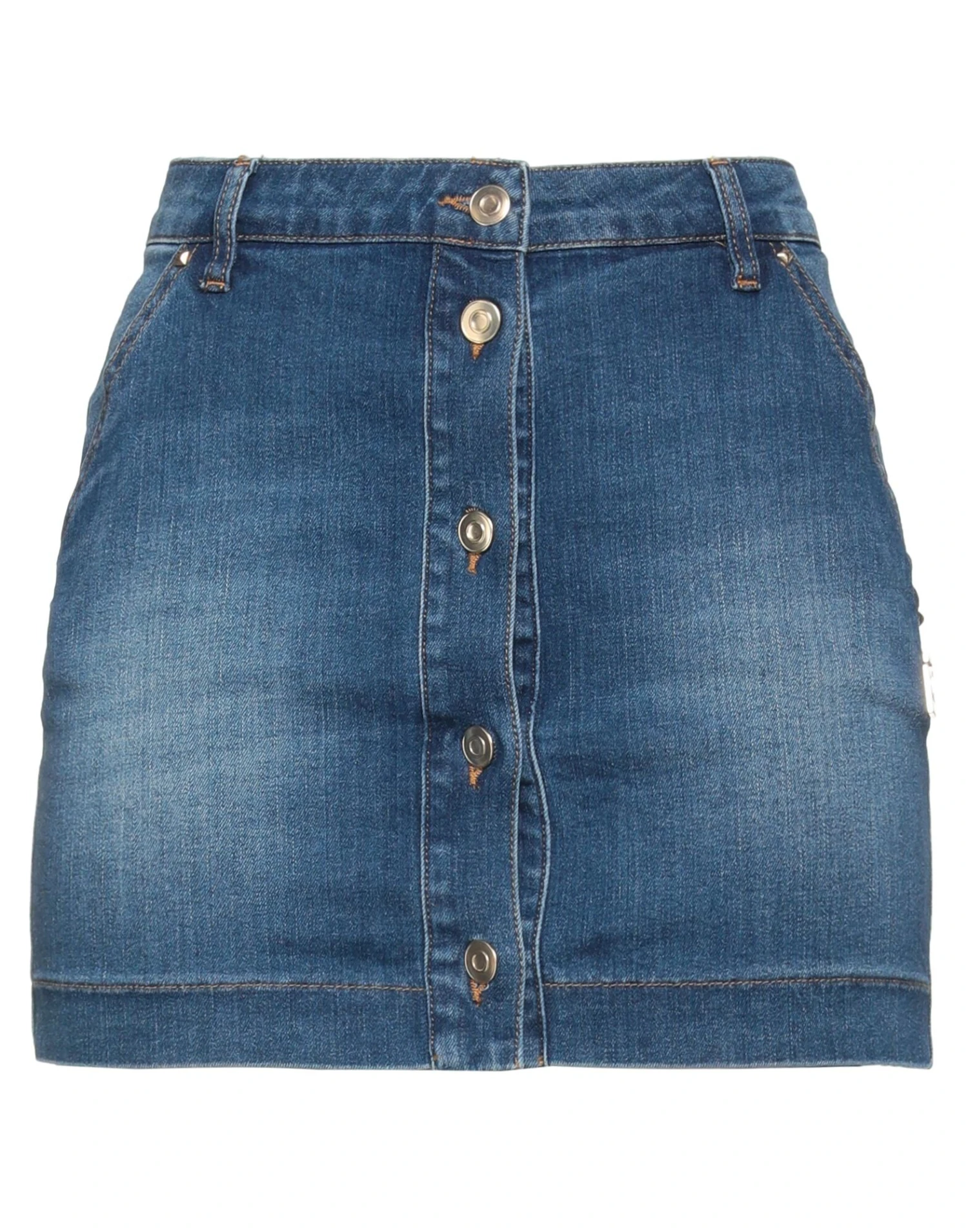 denim, faded, brand logo, solid color, medium wash, belt loops, unlined, button closing, multipockets, stretch, pencil style