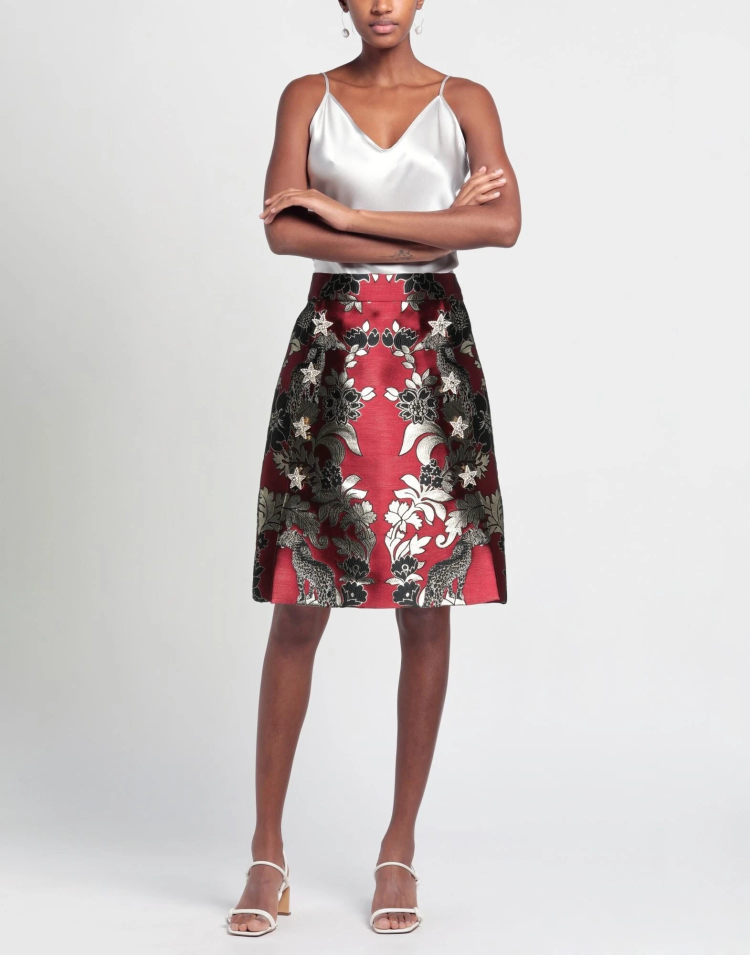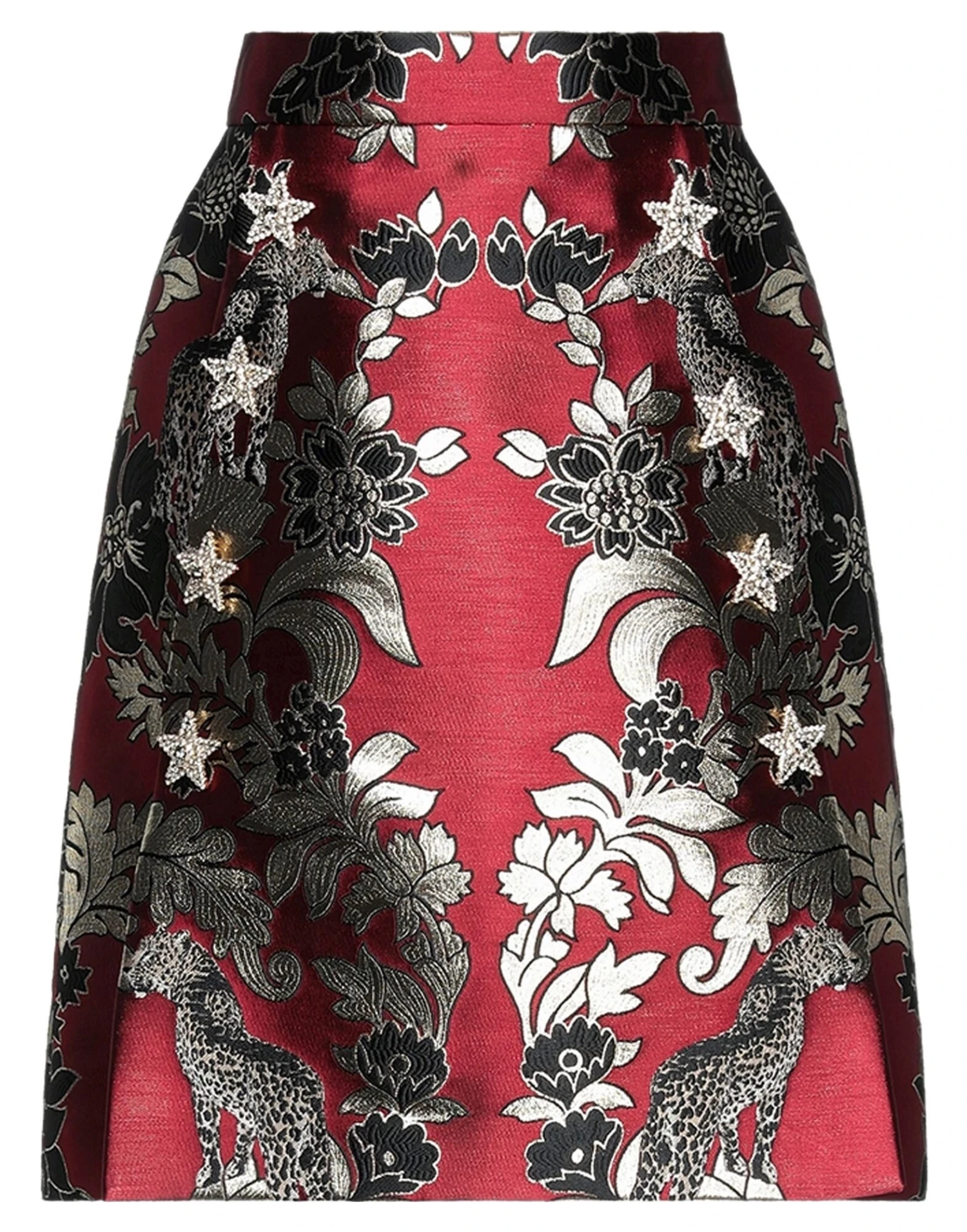 brocade, metal applications, rhinestones, lamé, floral design, fully lined, snap buttons fastening, zipper closure, no pockets