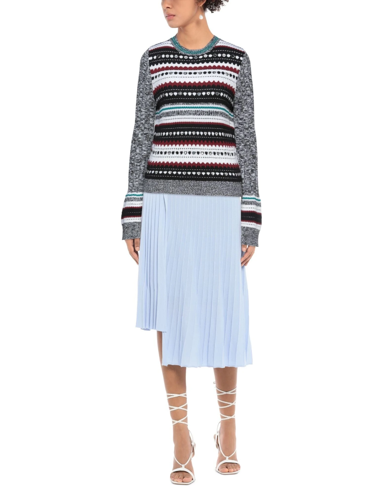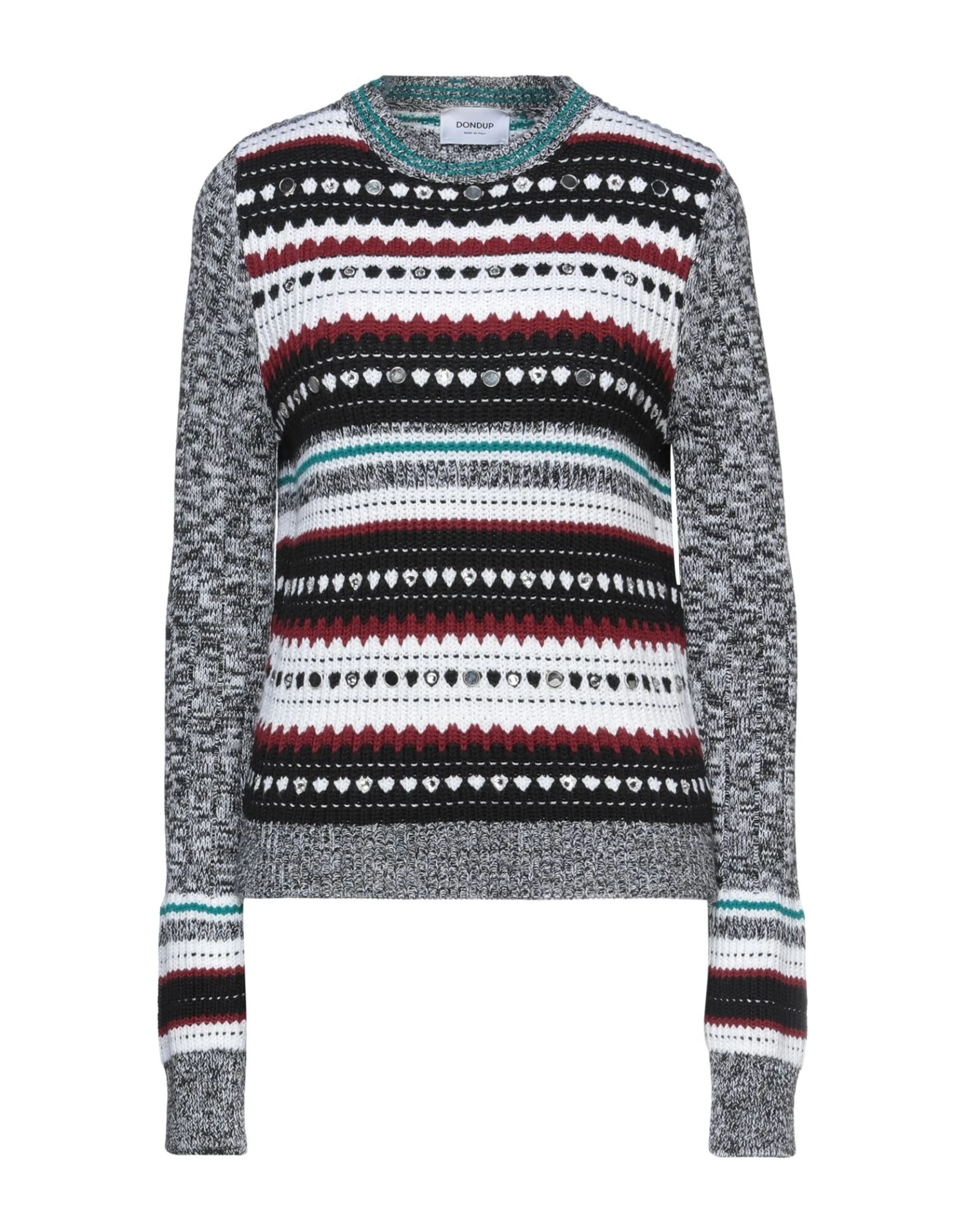 knitted, contrasting applications, multicolor pattern, round collar, medium-weight sweater, long sleeves, no pockets, small sized