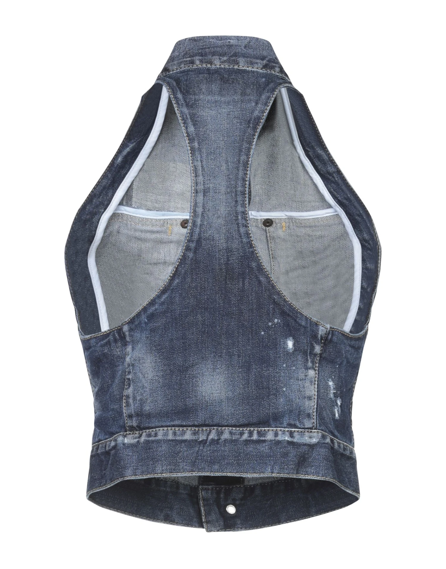 denim, faded, worn effect, logo, solid color, classic neckline, sleeveless, front closure, button closing, multipockets, stretch