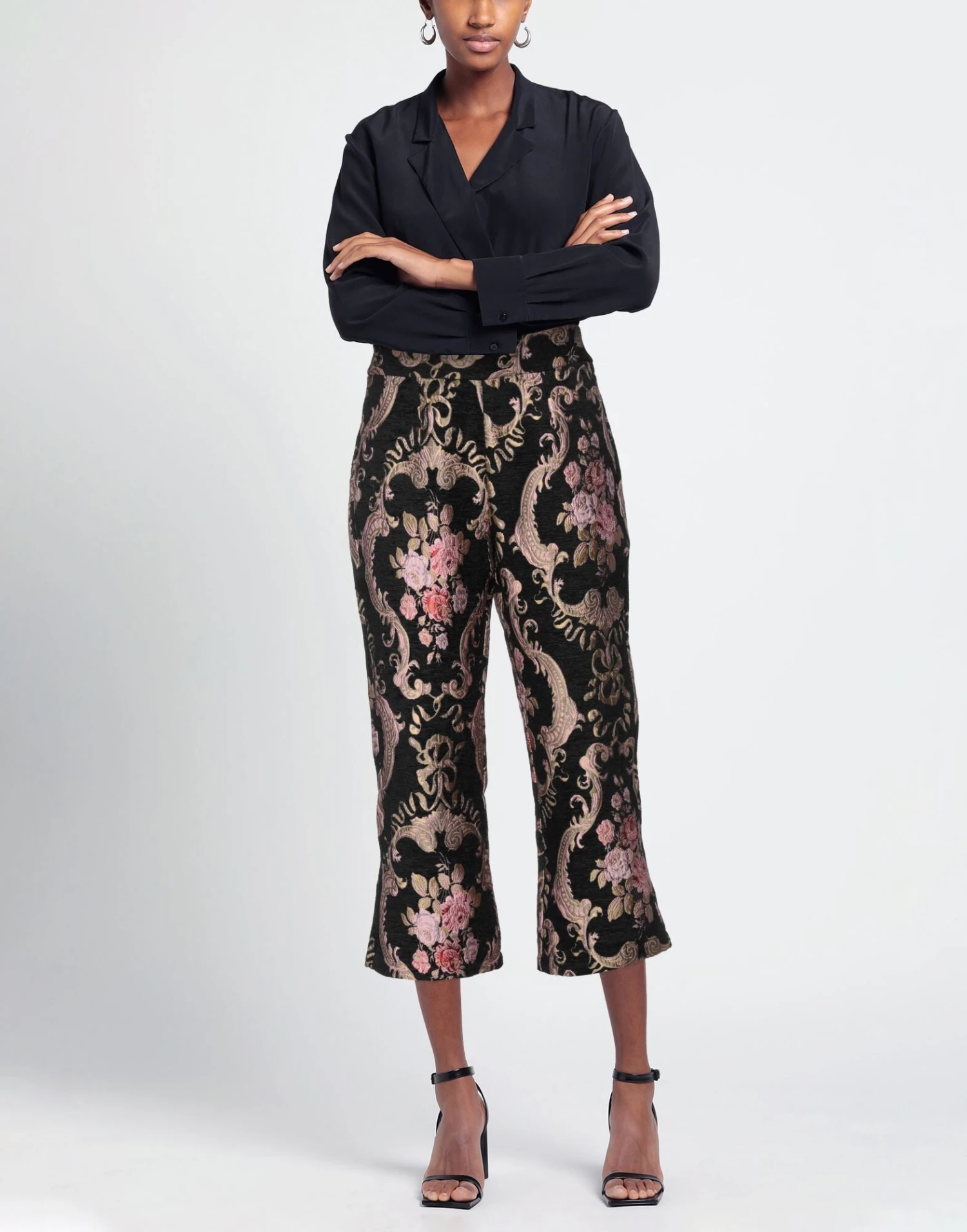plain weave, no appliqués, floral design, high waisted, flared cut, regular fit, zipper closure, hook-and-eye closure, no pockets, pants