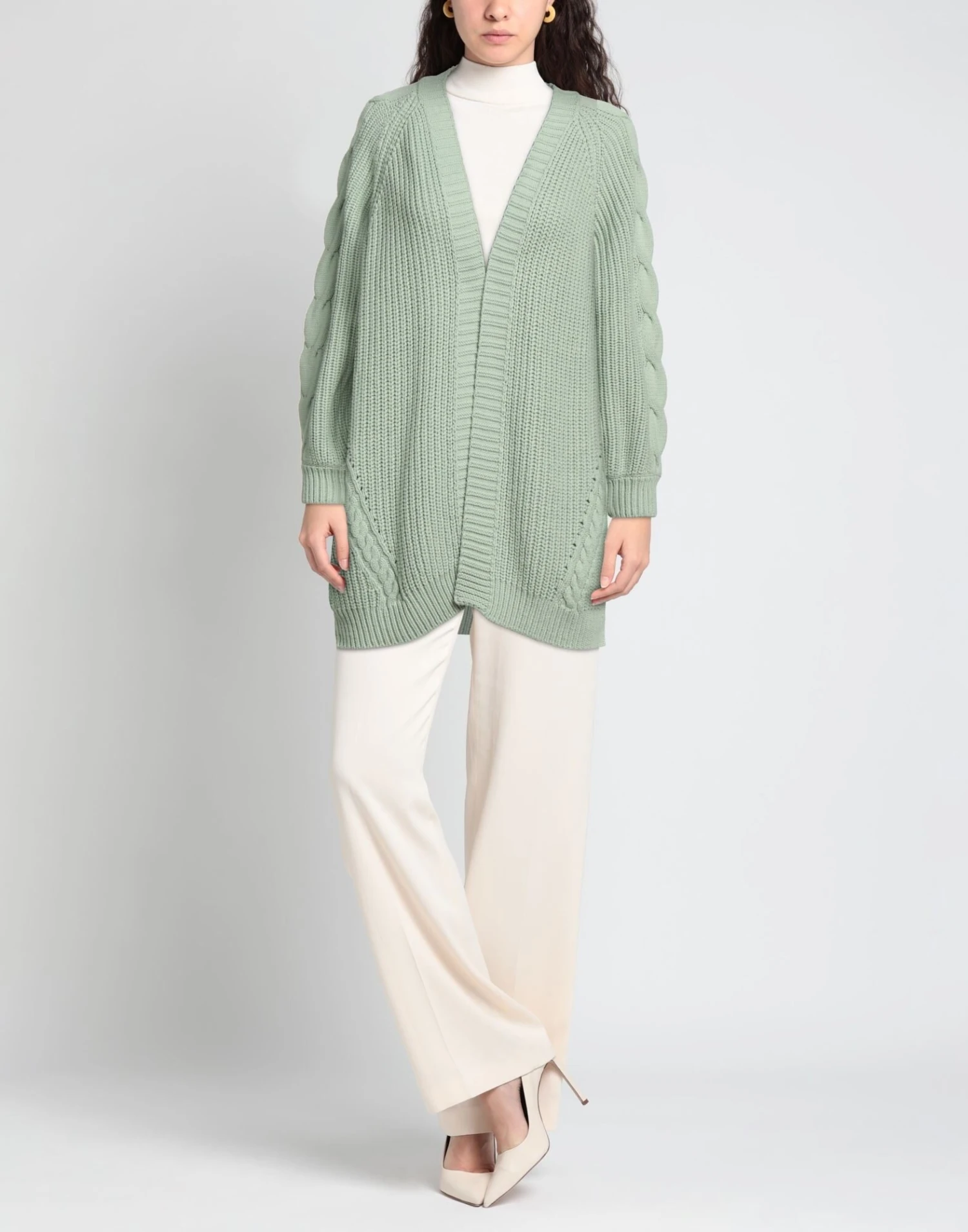 knitted, medium-weight knit, brand logo, solid color, deep neckline, long sleeves, no pockets