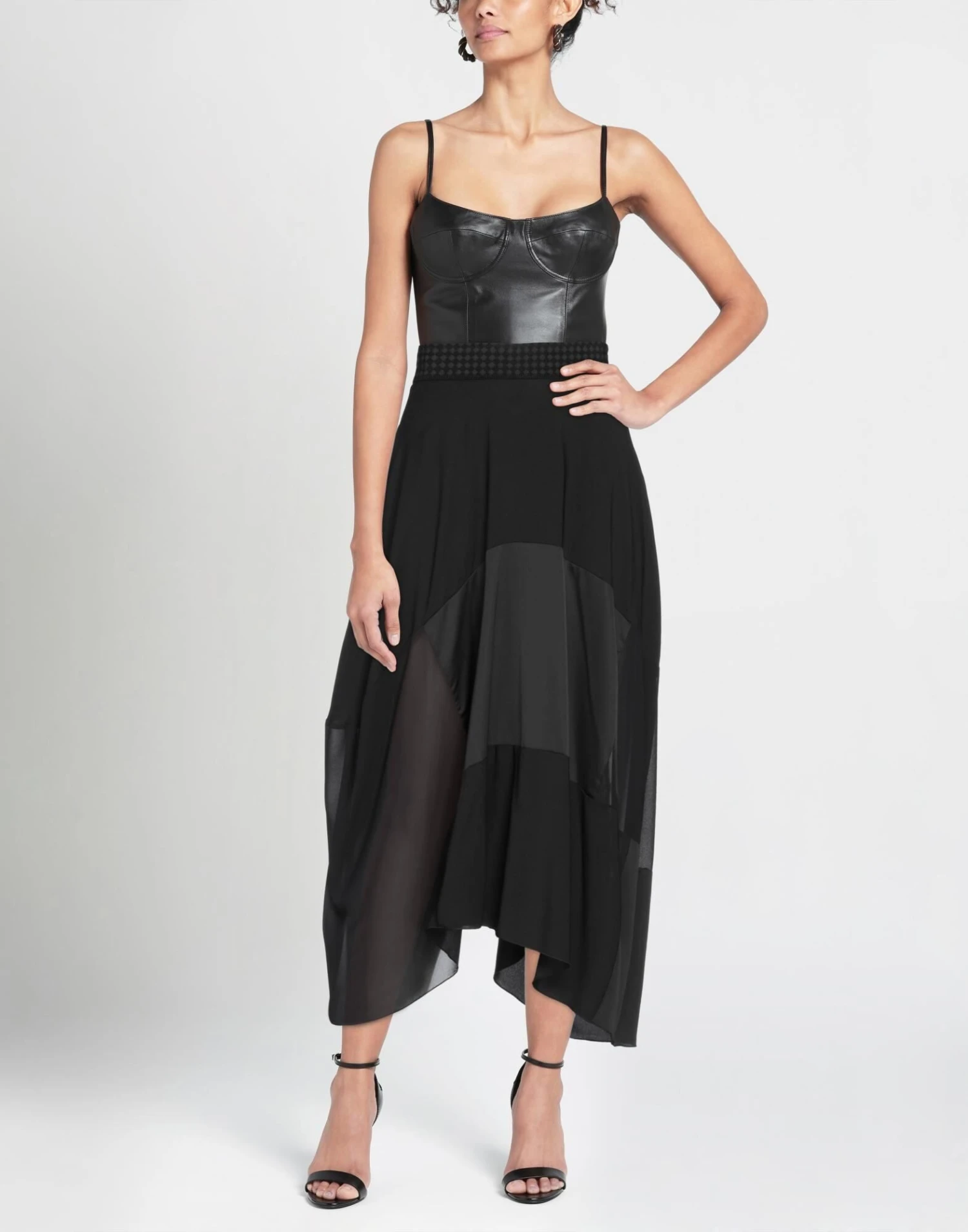 satin, crepe, brand logo, contrasting applications, solid color, elasticized waist, zipper closure, 1 button, single pocket, flared model