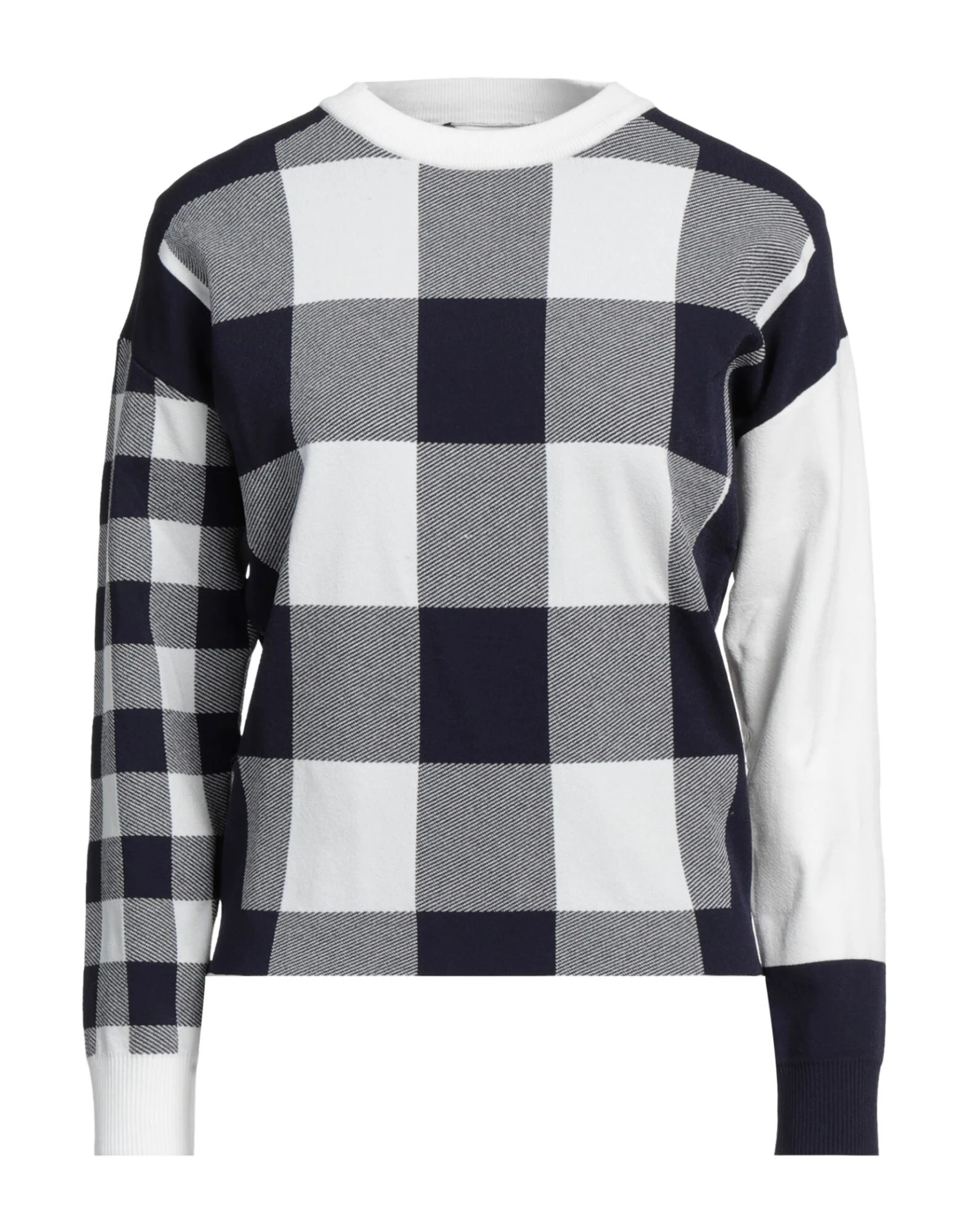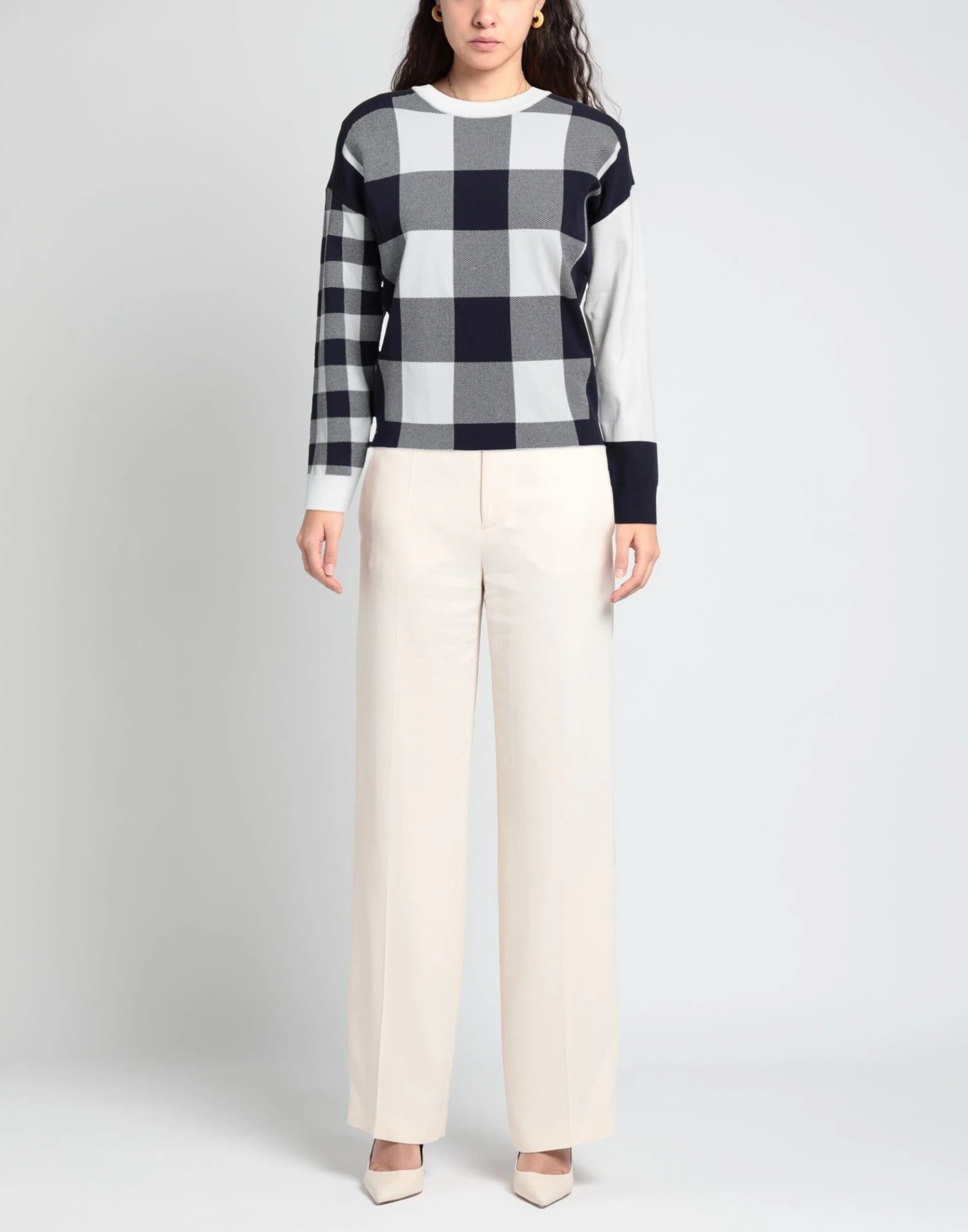 knitted, lightweight knit, checked, round collar, long sleeves, no pockets, no appliqués