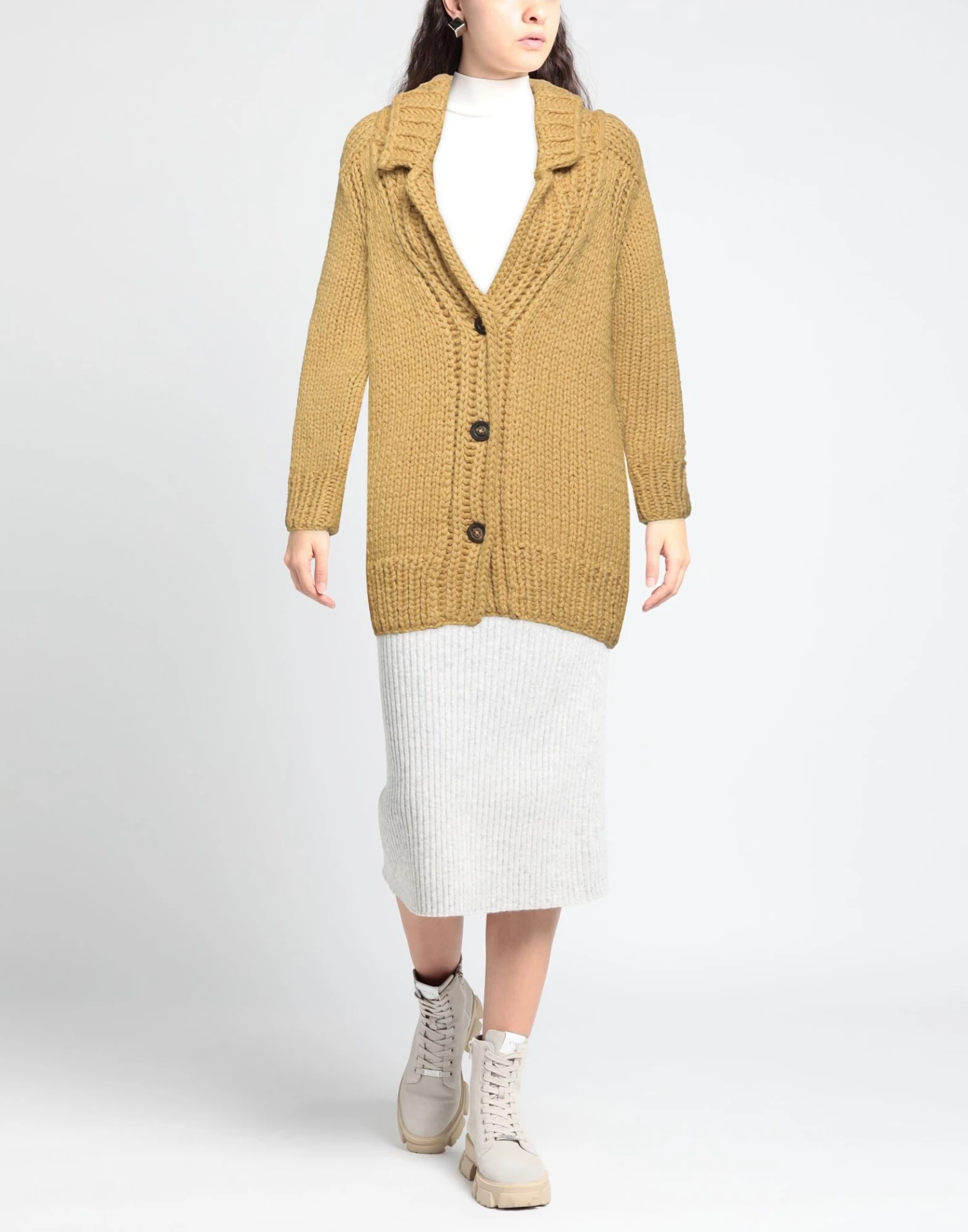 knitted, mélange, lightweight knit, no appliqués, solid color, lapel collar, long sleeves, button closing, no pockets