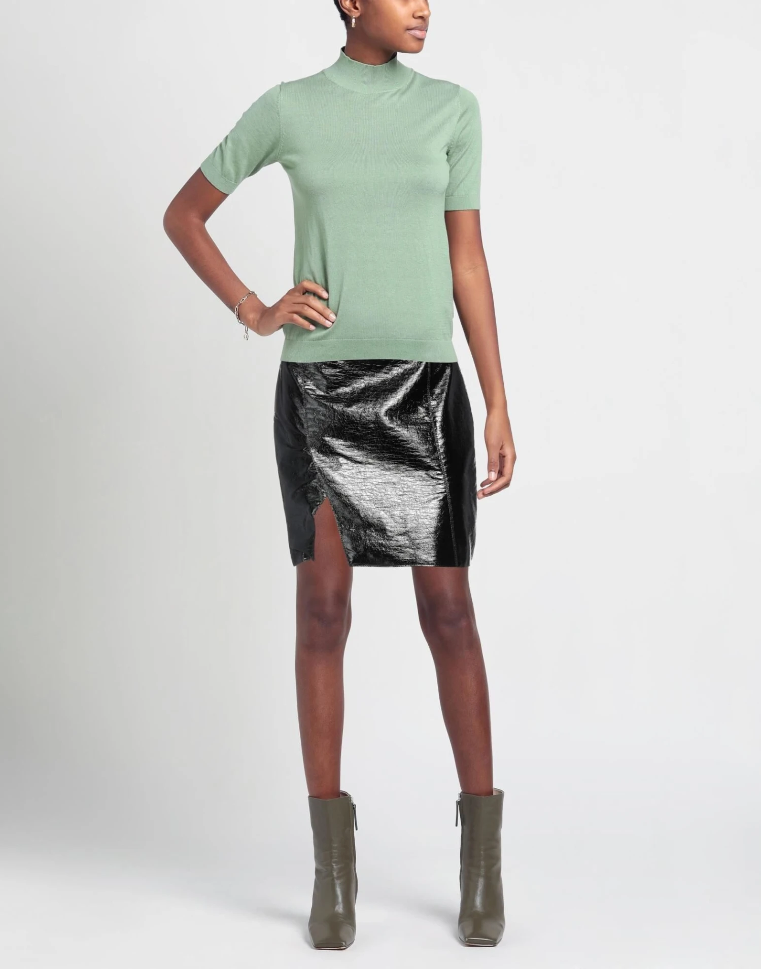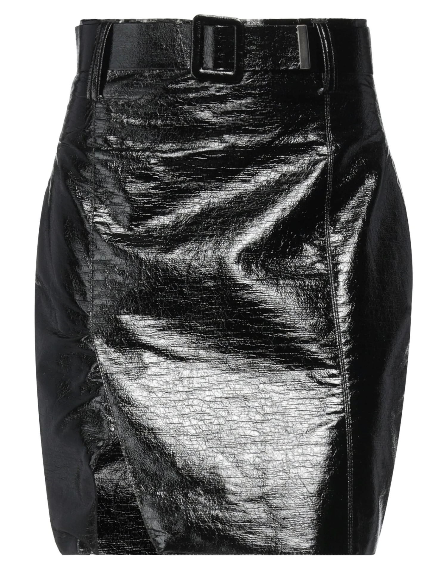 coated fabric, varnished effect, no appliqués, solid color, belted waistline, fully lined, zipper closure, no pockets, flared model