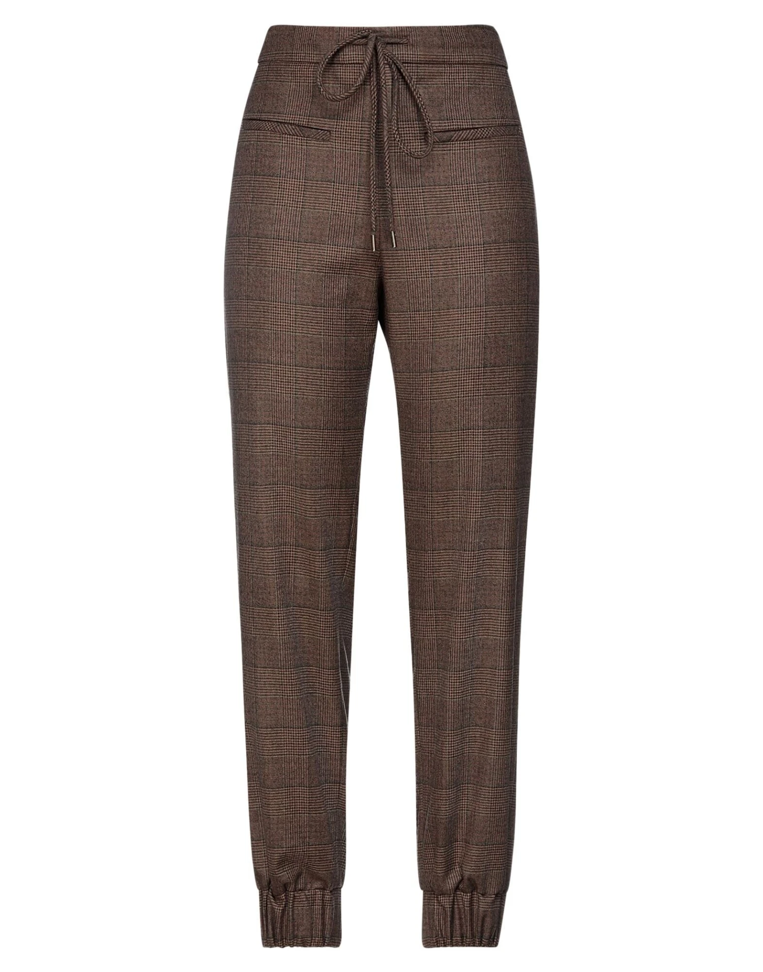 cool wool, glen plaid, high waisted, regular fit, tapered leg, drawstring closure, two pockets, with elastic bottom, no appliqués