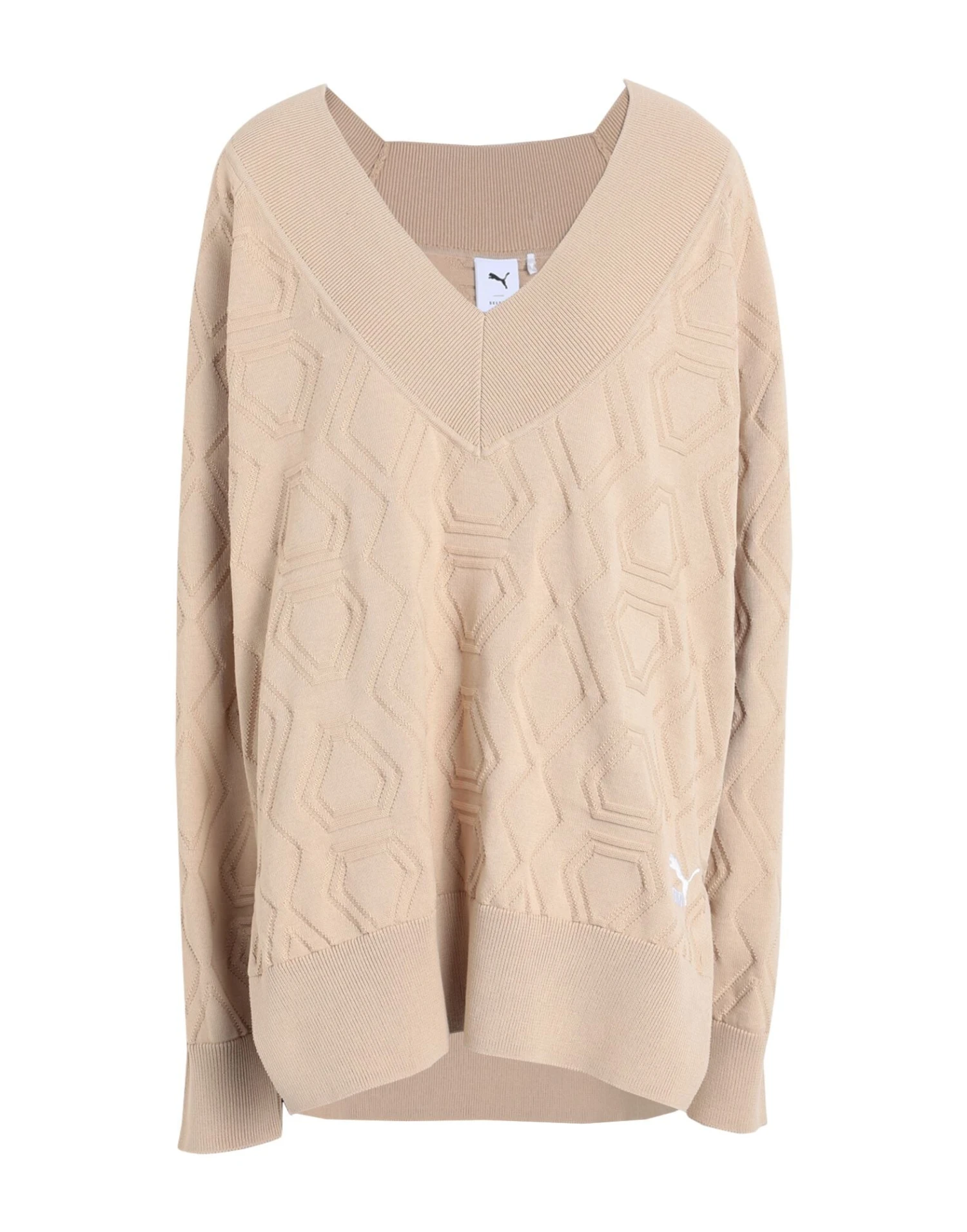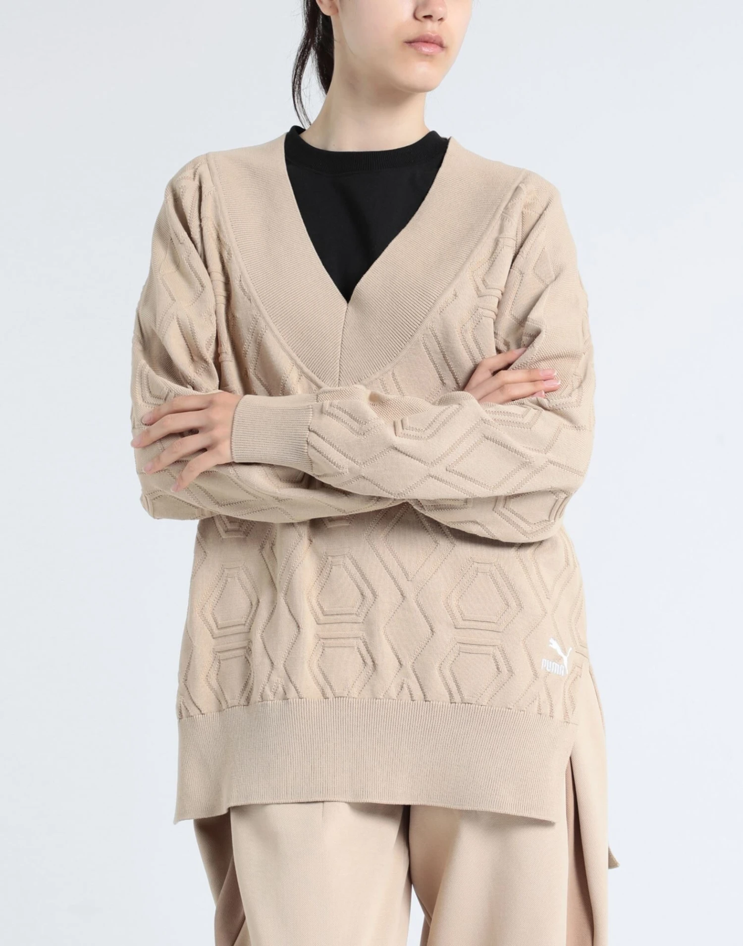 knitted, lightweight knit, brand logo, solid color, v-neck, long sleeves, no pockets, side slit hemline, lifestyle