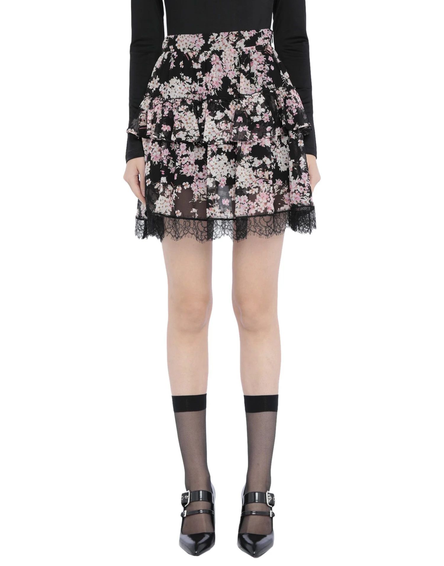 lace, crepe, frills, ruffles, floral design, no pockets, side closure, zipper closure, fully lined, large sized