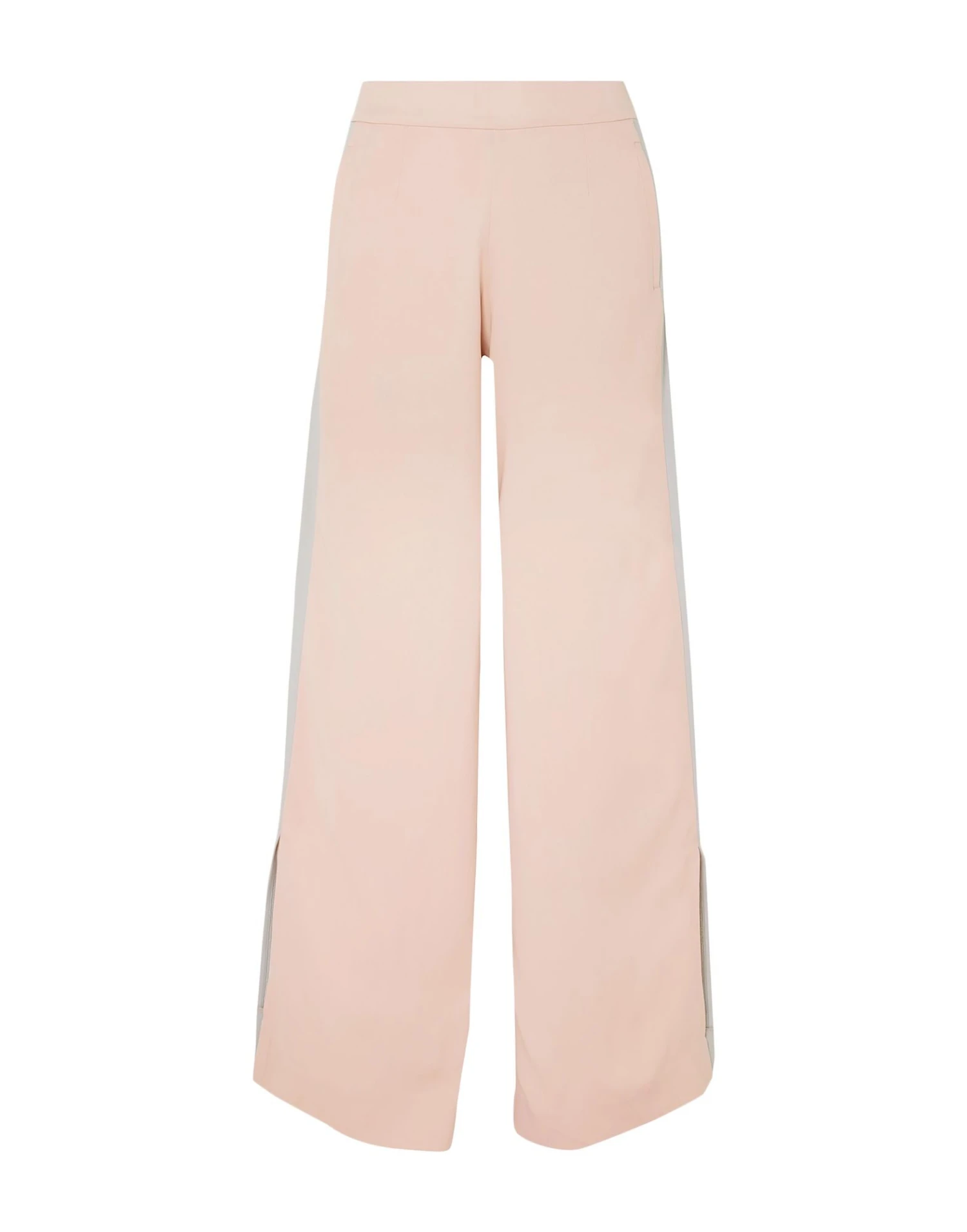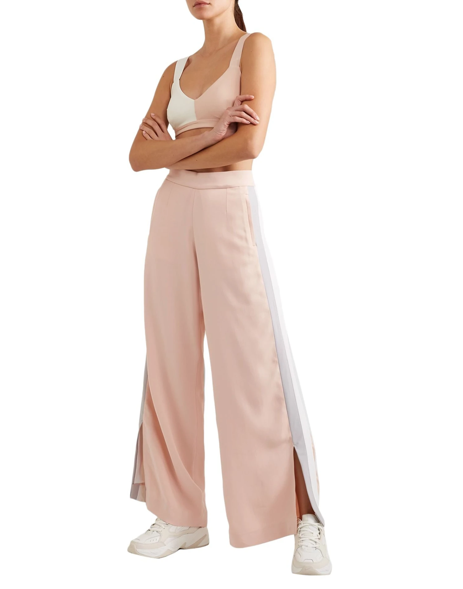 crepe, side seam stripes, solid color, high waisted, wide leg, regular fit, drawstring closure, side slit hemline, multipockets, pocket with zipper, stretch