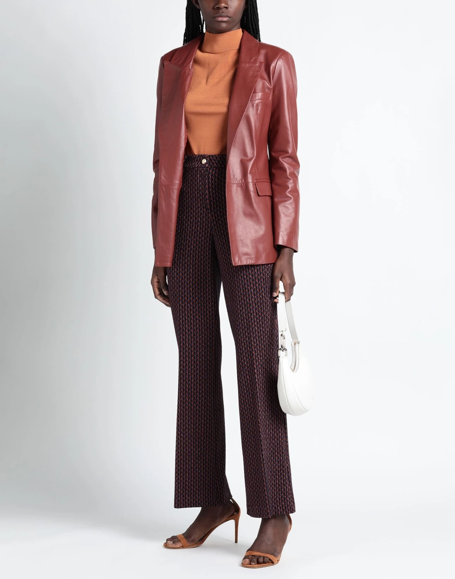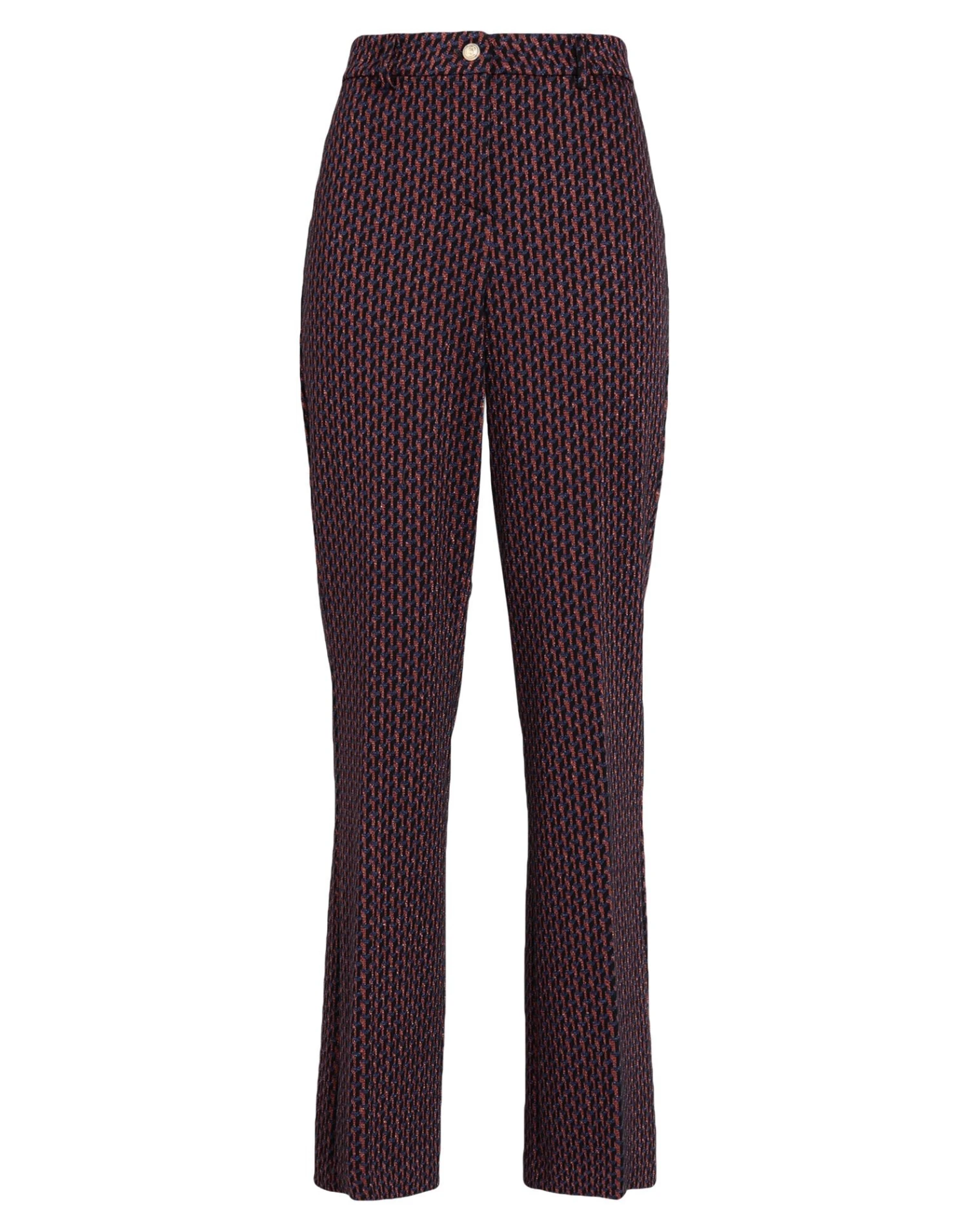knitted, lamé, lightweight knit, no appliqués, multicolor pattern, high waisted, belt loops, flared cut, regular fit, 1 button, zipper closure, no pockets, stretch