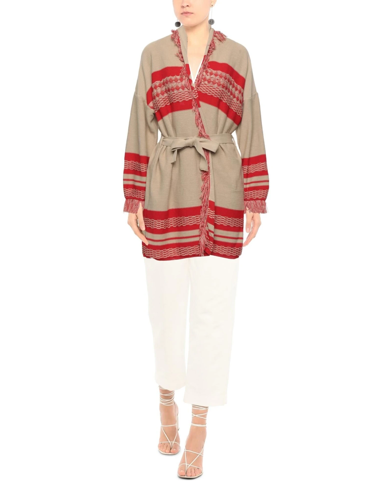knitted, fringes, belt, deep neckline, long sleeves, no pockets, lightweight knit, two-tone